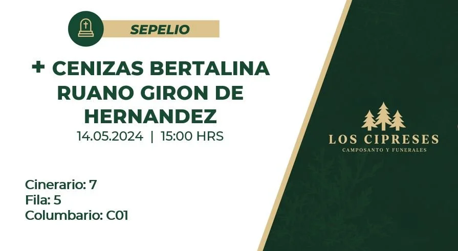 Ubicación del Entierro: Cinerario 7 fila 5 Monumento C01
