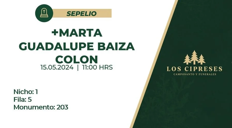Ubicación del Entierro: Nicho 1 Fila 5 Monumento 203