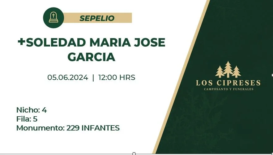 Ubicación del Entierro: Nicho 4 Fila 5 Monumento 229 Infantes